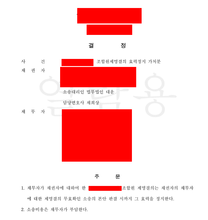 저희 법무법인 대운은 조합 측의 제명 결의가 절차적으로나 실체적으로 중대한 하자가 있어 무효임을 주장하며 ‘조합원제명결의 효력정지 가처분’을 신청했습니다. 특히 조합이 내세운 6가지 제명 사유가 얼마나 허구적인지를 조목조목 반박하는 데 변론을 집중했습니다.